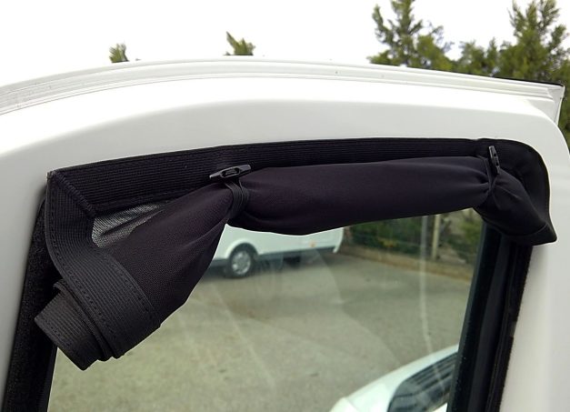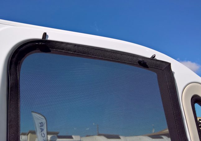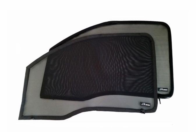La marque asiatique Auviato a développé une solution innovante pour pouvoir rouler avec les vitres ouvertes de son véhicule sans craindre les coups de soleil, les insectes ni les courants d'air. Le filet de protection UV-Bug'Guard fait appel à un écran perforé, comme une moustiquaire, légèrement opaque et qui réfléchit les rayons solaires tout en atténuant les nuisances sonores du vent.