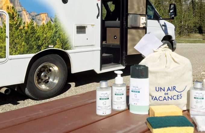 Créé par Agnès Amoretti et Isabelle Fouasson, ce kit permet aux personnes qui débutent en camping-car, ou qui en loue un régulièrement, d’acheter juste ce qu’il faut de produits (liquide vaisselle, sacs poubelles, éponges…)