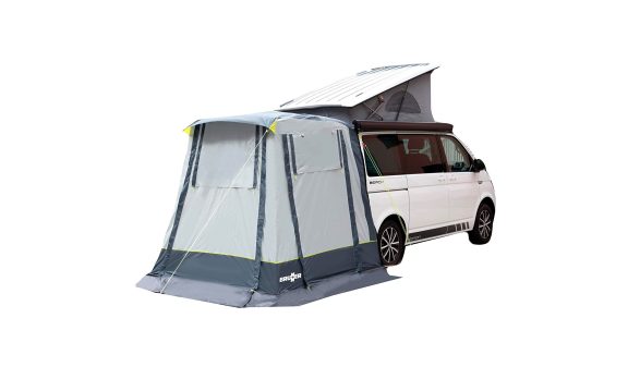 L’accès à cet espace est facilité par la présence de deux grandes portes latérales. Tous les ouvrants sont équipés d’une moustiquaire et d’un volet d’occultation. Affichant un poids modéré (5,1 kg) et une taille raisonnable une fois replié (L 63 x l 18 cm), l'auvent Comet peut se ranger facilement dans le coffre d’un van Volkswagen.