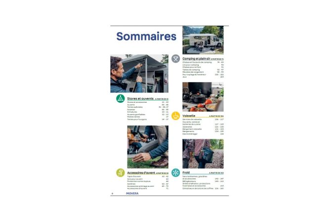 L'enseigne allemande Movera propose son nouveau guide d'accessoires référençant près de 20 000 produits classés en dix catégories (Stores et auvents, Accessoires d'auvent, Camping et plein air, Vaisselle, Froid, Grill et gaz, Technique, Multimédia, Electricité, Eau).