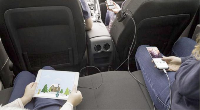 - le Family Car Charger. Il suffit de brancher ce chargeur USB dans une prise 12 V type allume-cigare pour pouvoir alimenter l’ensemble du dispositif de recharge. Ce dernier comprend 4 ports USB dont la capacité totale est de 5,8 ampères. Ce boîtier se montre assez puissant pour recharger smartphones, tablettes, liseuses, lecteurs MP3 ou tout autre dispositif alimenté via une prise USB. Son câble de 180 cm de long permet même aux passagers situés sur la banquette arrière d'y brancher leurs appareils mobiles. Un clip est prévu pour l'accrocher facilement sur la poche aumônière d'un siège avant.