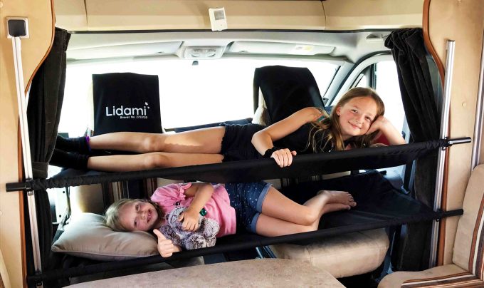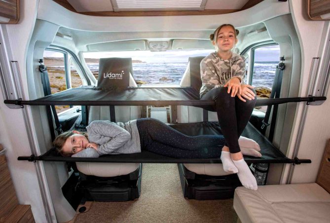 Pratique et innovant, le concept Lidami permet d’installer deux lits superposés pour enfants sur les sièges avant du camping-car.