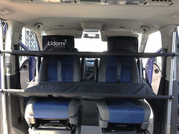 Dûment breveté, Lidami facilite la mise en place de deux lits superposés pour enfants sur les assises avant du camping-car, une fois les sièges de cabine retournés vers le salon. Ce concept exploite astucieusement l’appuie-tête et le dossier des sièges.
