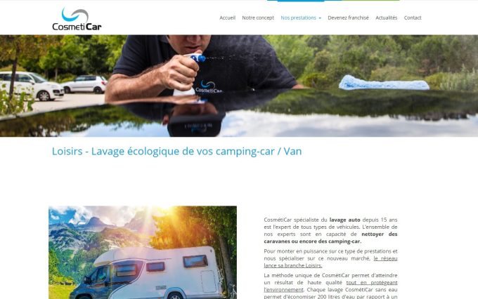 Créée en 2005, la société Cosmeticar est le spécialiste et leader du lavage de véhicule sans eau en France. Son concept novateur permet d’économiser jusqu’à 200 litres par rapport au lavage classique. Une méthode écologique qui a fait ses preuves mais qui, jusqu’à aujourd’hui, était réservée aux seules voitures et aux bateaux. Mais la société, consciente de l’importance du marché du véhicule de loisirs, a décidé aujourd’hui de s’y consacrer également. Un secteur qui ne lui est pas inconnue puisque que Cosmeticar travaille avec certains acteurs de la location de vans et camping-cars et, de ce fait, peut se targuer d’une réelle expérience. Aujourd’hui, le réseau de franchisés regroupe plus de 80 acteurs en France, qui se déplacent sur le lieu de votre choix (domicile, parking, camping, aire de stationnement…) pour procéder au lavage, qui comprend la désinfection de la cellule. Une bonne solution pour garder son camping-car étincelant, tout en préservant l’environnement.