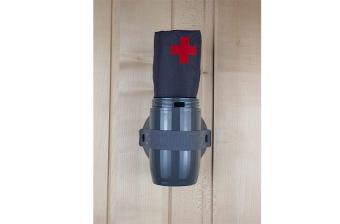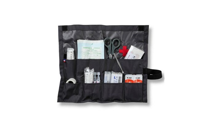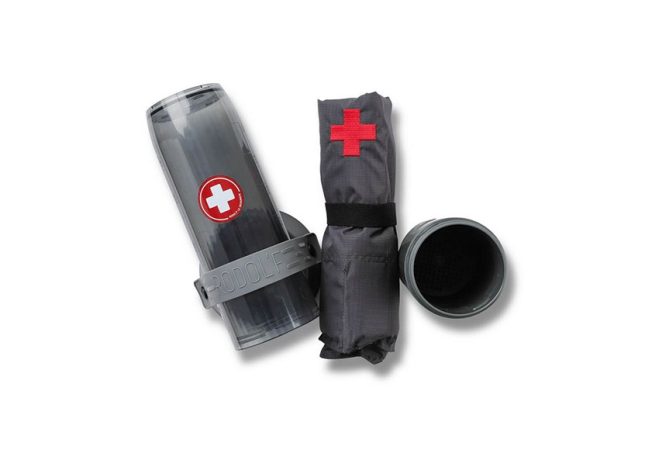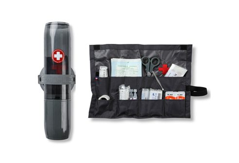 Son tube se présente comme une trousse à pharmacie miniature. Une fois ouverte, celle-ci permet d'y retrouver facilement une paire de gants en vynil, une paire de ciseaux, une pince à écharde, un rouleau de sparadrap, une bande de gaze extensible (4 m x 7 cm), 5 compresses (7,5 x 7,5 cm), un assortiment de 15 pansements, une dose de gel contre les brûlures, 2 doses de gel Arnica contre les chocs, 2 doses de gel hydro-alcoolique, 2 doses de sérum physiologique (5 ml), 3 doses d'antiseptique chlorhexidine, sans oublier une couverture de survie.