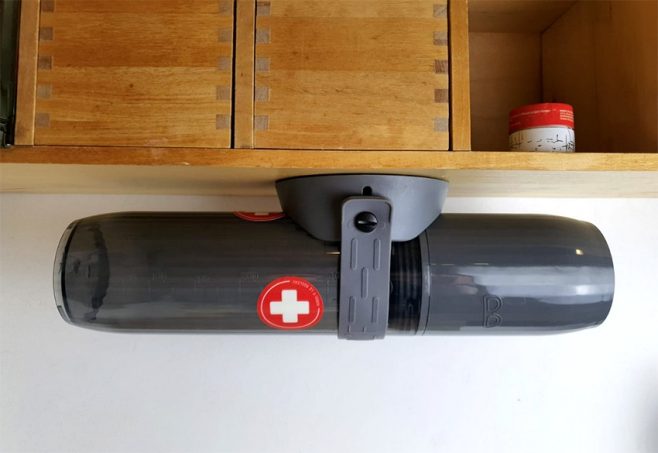Il est équipé pour cela d'une astucieuse fixation qui permet de le placer soit à l'horizontal soit à la verticale (support principal à visser ou coller), à l'emplacement choisi dans le véhicule (chambre, cuisine, salon, cabine).