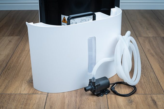 Une pompe alimentée par l’appareil, disponible en option, peut au besoin effectuer un drainage en continu de l’eau, sans avoir personne à côté pour le surveiller. L’eau est aspirée du réservoir pour être déversée ensuite dans un évier ou un bac à douche, dans un camping-car.