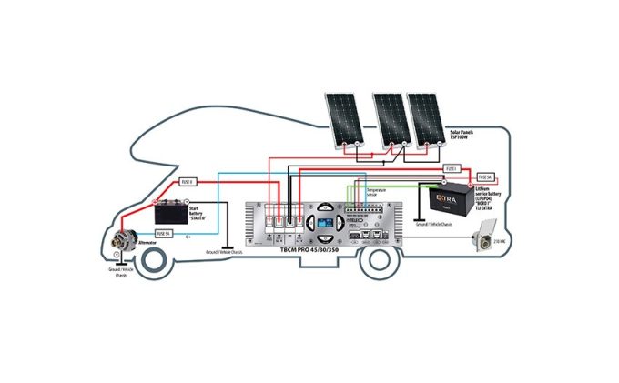 Un camping-car se doit de posséder un système de charge comme le Teleco TBCM PRO 45/30/350. Utile en roulant ou à l’étape, ce chargeur de batterie automatique à trois sources fonctionne soit avec l'alternateur de 45 A du porteur, soit avec le réseau électrique 230V ou bien un générateur 30 A avec panneaux solaires (pour un total maximum de 350 W). Dans cette configuration, le régulateur de charge intégré utilise la technologie MPPT.