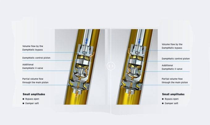 Le principal atout d'un combiné B6 Camper est de pouvoir ajuster ses caractéristiques d'amortissement tout seul en fonction de l'état de la route. Il est doté pour cela d'une technologie exclusive Bilstein baptisée DampMatic. Celle-ci permet aux amortisseurs de basculer entre deux courbes de fonctionnements sans l'aide d'une électrovanne. Purement mécanique, ce système fait appel à une deuxième chambre aménagée à l'intérieur de l'amortisseur. Le véhicule peut donc rester plus stable sans composants, câbles ou unités de commande supplémentaires. Avec la technologie DampMatic, un B6 Camper peut réagir de manière sensible et rapide en absorbant le bruit sur un asphalte rugueux toute en améliorant les caractéristiques de roulement sur une route constituée de pavés. Son efficacité reste aussi perceptible dans les virages, ou lors de changements de voie, sans engendrer de roulis exagéré.