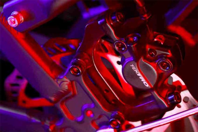 Le freinage est assuré, à l'avant comme à l'arrière, par des disques ventilés de chez Tektro à commande mécanique. Pour un meilleur confort, la fourche avant RST est télescopique, comme le tube de la selle en cuir Royal de chez Justek.