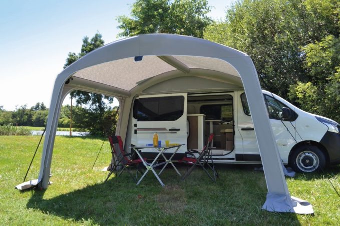 Ce modèle gonflable s’installe rapidement à côté d’un camping-car ou d’un fourgon. La toile est tenue par une armature à air composée de trois tubes gonflable, de deux barres de relevage en acier et d’une autre barre de maintien du sas. L’entrée est équipée d’une moustiquaire dotée d’une fermeture à glissière et d’une fenêtre à film transparent qui peut opacifier. Idem pour les parois latérales.