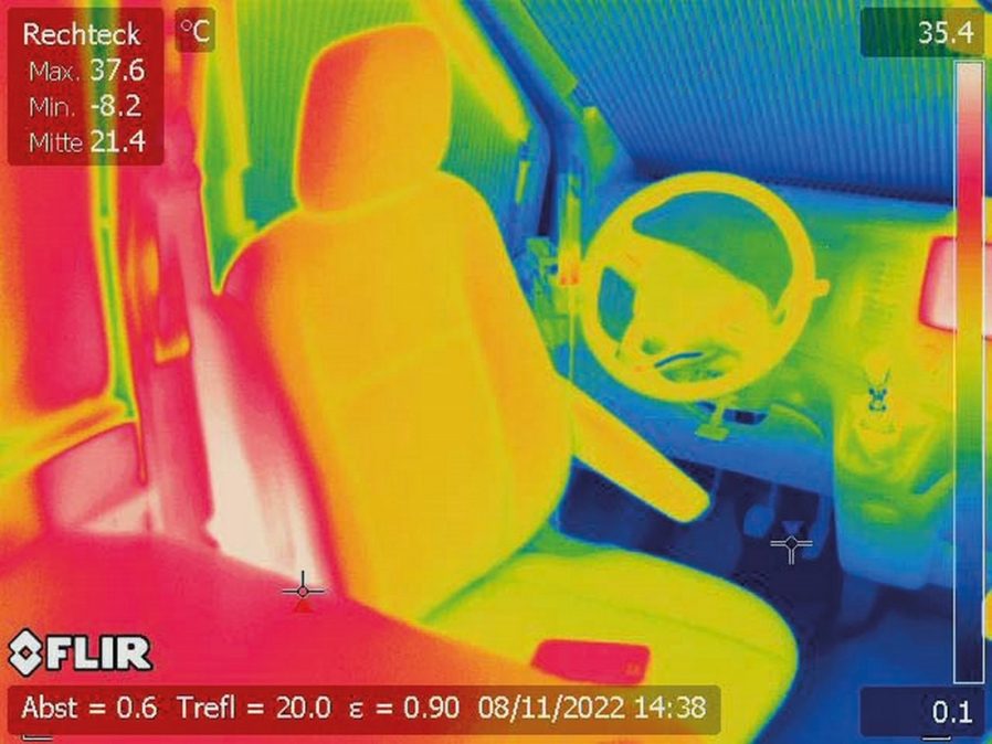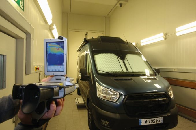 Pour détecter les ponts thermiques, des images thermographiques sont réalisées par une caméra thermique à infrarouge qui indique les endroits chauds, tièdes et froids. Spectaculaires, elles sont surtout intransigeantes, montrant les points du camping-car où subsiste l’air glacial. Tout ce qui est bleu est froid, tout ce qui est rouge est chaud, le tiède étant représenté par des teintes cyan, jaune et orangée. Ces bandes de couleurs permettent ainsi d’améliorer l’isolation, de redimensionner le flux d’air du chauffage ou d’en corriger son circuit dans l’habitacle, si besoin.