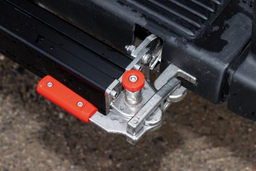 Le XM290 présente une autre particularité : on peut y fixer une boule d’attelage, laquelle est emboitée (un clic indique sa bonne installation) et bloquée par une serrure sécurisée par une clé. On peut alors tracter une remorque jusqu’à 2 tonnes de PTAC. Cette boule ne peut être installée que lorsque le porte-vélo est en position « fermée ». Dans ce cas, il n’est plus possible de manipuler le bras articulé et d’ouvrir les portes arrière du fourgon.
