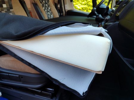 Le produit protégé par une housse est composé d’un matelas plié en trois, auquel s’ajoutent deux coussins triangulaires. Ces derniers servent à combler les deux vides laissés au niveau des sièges. Une fois ces deux coussins installés, on glisse le pied du matelas sous le volant jusqu’à la portière avant le déployer le centre et la tête de lit. On avance enfin les sièges pour approcher le bord du matelas de la planche de bord et caler l’ensemble (ce qui permet de ne pas utiliser la sangle de maintien fournie avec le kit). La manipulation est simple et rapide. Ce matelas complémentaire est exploitable par un enfant, voire un adolescent. En effet, ses dimensions (53 cm au pied et 70 cm aux épaules, sur 158 cm de long) sont satisfaisantes pour s’y allonger et y passer de bonnes nuits. Un léger décroché du matelas épouse parfaitement la console centrale. Le niveau de confort est garanti par une mousse de 9 cm d’épaisseur posée sur un contreplaqué de 8 mm qui rigidifie et assure une bonne stabilité à l’ensemble.