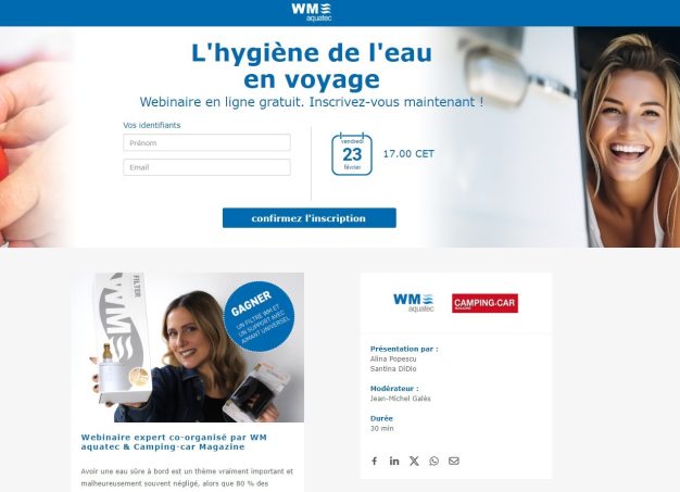 Tous les camping-caristes qui souhaitent éviter les problèmes de santé provoqués par une eau contaminée ou qui désirent bénéficier d’une eau potable dans leur camping-car, sont invités à assister à ce webinaire.