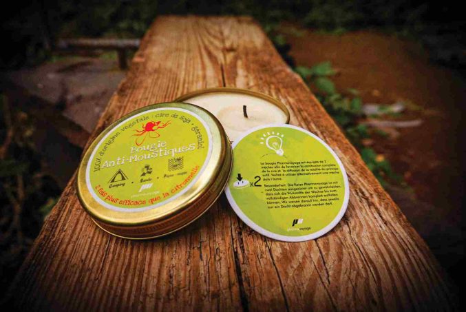 D’origine 100 % végétale, la bougie anti-moustiques Pharma-Voyage est composée de cire de soja (95 %) et de géraniol (5 %). Testée in vivo, elle s’avère 5 fois plus efficace que les bougies à la citronnelle. Elle maintient les moustiques à 1 m environ