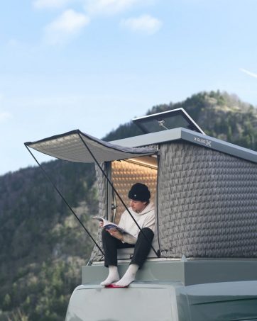 Sur une structure en sandwich composée d’aluminium et de polyuréthane, il fait gagner 30 cm de hauteur au véhicule. Mais la grande particularité de ce toit, ce sont ses parois gonflables. Il est donc relié à un compresseur rotatif. En deux minutes, les boudins sont gonflés. L’appareil se déclenche pendant quelques secondes toutes les 8 heures grâce à la surveillance électronique de la pression de l’air. Pour le dégonfler, l’utilisateur peut soit passer par l’application mobile, soit par le panneau de contrôle.