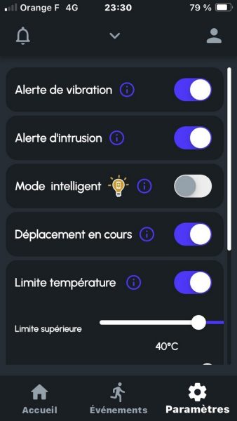 L’application peut être paramétrée de plusieurs manières. En activant le “Mode intelligent”, les fonctions intrusions et vibrations sont inactives. On peut aussi désarmer la totalité du système pendant une heure et jusqu’à 48 heures. Lorsque le laps de temps choisi est dépassé, le réarmement est automatique. Il est aussi possible d’envoyer la position GPS de son camping-car à un tiers, comme la Police ou la Gendarmerie, en cas de vol.