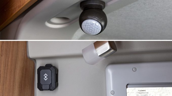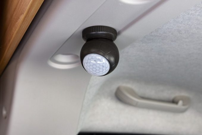 Pour décliner les avantages du Vanguard, il faut commencer par vanter le très faible encombrement des boîtiers et la facilité de leur installation. On perd plus de temps à trouver un emplacement pour les deux éléments que pour les fixer à l’aide d’un double-face fourni. Pas plus gros qu’une balle de ping-pong, le détecteur de mouvement et d’intrusion s’aimante sur son petit support. Cette fixation permet de l’orienter facilement (360° en horizontal et 110° en vertical) face à la porte latérale de notre fourgon aménagé.