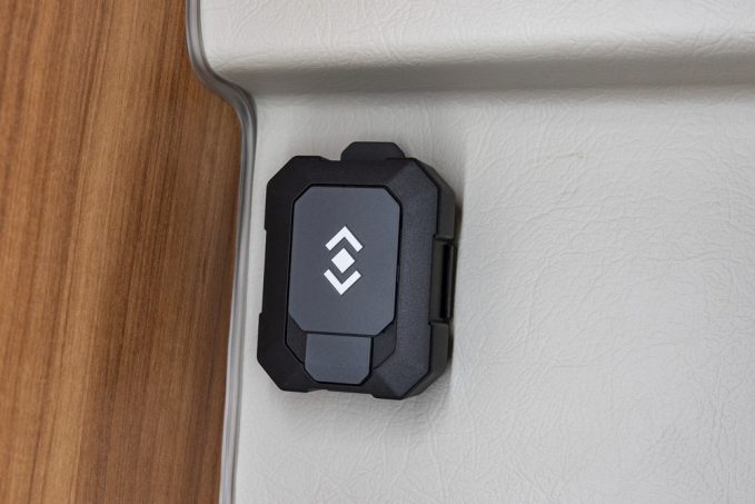 Le deuxième élément est le cerveau du système. C’est un boîtier de la taille d’un jeu de cartes, à coller sur une paroi intérieure du camping-car ou à dissimuler dans un porte-épices, entre deux flacons… Le capteur (la balle de ping-pong) est alimenté par une pile qu’il est conseillé de changer entre 18 et 24 mois. Le boîtier Vanguard se recharge quant à lui en le connectant, tous les 3 ou 4 mois, sur une prise USB. Il suffit donc de quelques minutes pour terminer l’installation qui ne nécessite donc ni perçage, ni vissage, ni passage de câbles. Un vrai jeu d’enfant. Il ne reste plus qu’à télécharger l’application Fencive (disponible en versions iOS et sur Android) et créer un compte pour que le système soit opérationnel. Pour une efficacité totale, il est vivement conseillé d’autoriser les notifications. Comme beaucoup de systèmes de tracking, Fencive propose plusieurs types d’abonnements. Nous y reviendrons plus loin.