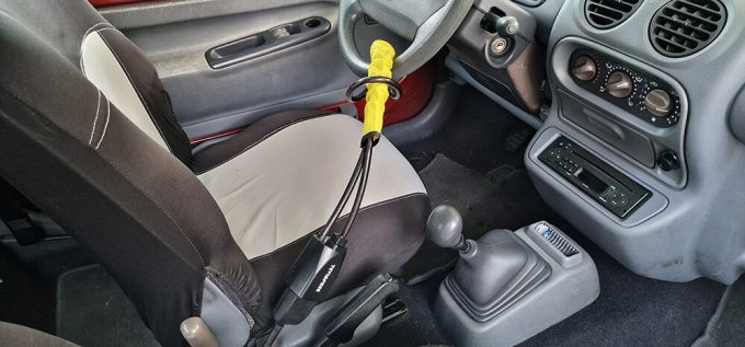 La marque Exosfer, dont nous avons déjà parlé sur notre site, présente un antivol tape-à-l’œil avec une partie jaune. Le but ? Être identifiable pour décourager toutes les tentatives de vol. En plus de la prévention, le système s’installe aisément grâce à une fixation sur le volant d’un côté et de l’autre au niveau de la boucle de ceinture du siège conducteur. Le système entrave ainsi le volant efficacement. Ce modèle est aussi portable et peut se ranger facilement dans la boîte à gants ou dans une portière.