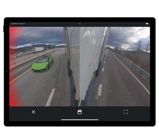 - La vue caméra en direct sur chaque côté du véhicule améliore la perception de l'environnement ; visible dans la cabine via une tablette couplée ou un GPS dēzl LGV.