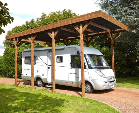 Abri spécial camping-car en bois pour hiverner son véhicule de loisirs à domicile. Ce carport auto-portant déjà traité couvre 28,6 m². Hauteur de passage avant : 3,64 m. Largeur de passage : 357 cm. Dimensions : 404 x 802 x 394 cm. Montage : deux jours pour deux personnes.