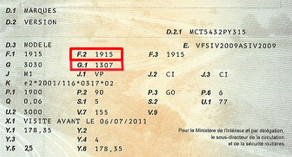 • Le PTAC (Poids Total Autorisé en Charge), que l’on trouve sur la carte grise au repère F.2 comme expliqué ci-dessus