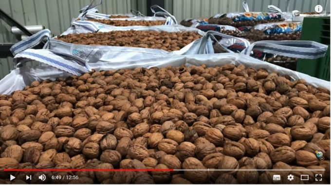 La récolte se fait de deux manières : soit en secouant le tronc des arbres à l’aide d’un bras oscillant animé par un tracteur, soit en faisant passer un hélicoptère au-dessus de la cime des arbres, le rotor servant alors de grand ventilateur qui fait vibrer les branches pour que les noix tombent sur le sol. Etonnant !