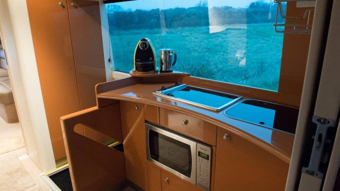 L’aménagement intérieur a été réalisé sur mesure pour Ferrari. Ce camping-car de luxe qui accueilli les pilotes et des membres de la Scuderia durant les Grands Prix.