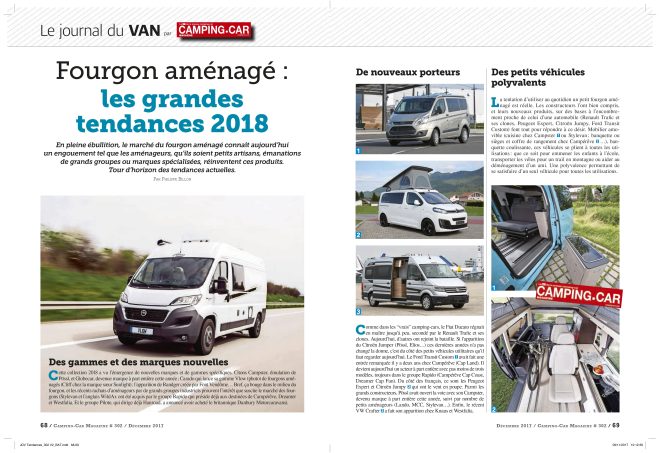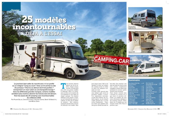 Cette semaine dans les kiosques, retrouvez le nouveau numéro de Camping-Car Magazine daté du mois de décembre. Ce numéro 302 est consacré aux 25 modèles incontournables de camping-car. Capucine ou intégral, lit central ou lits jumeaux, compact ou long… La Rédaction vous propose de découvrir parmi les grandes marques, les futurs véhicules stars de 2018. Dans le journal du van, on vous dit tout sur les grandes tendances de l’année en matière de fourgon aménagé.