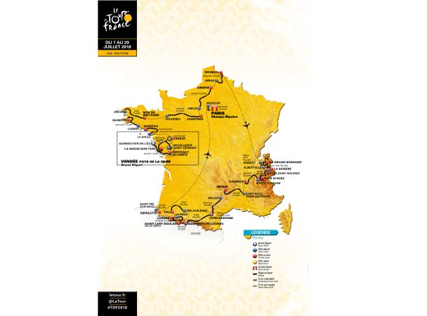 La 105e édition du Tour de France se déroulera du 7 au 29 juillet 2018. Le parcours de la célèbre course cycliste a été présentée ce mardi à Paris. Les compétiteurs s’élanceront depuis l’île de Noirmoutier en Vendée. Ils passeront par la Roche-sur-Yon, Cholet, Lorient, Brest ou encore Arras pour les premiers jours de la course. Dans la dernière partie du tour, après un passage à Annecy, ils passeront par Albertville, Mende, Millau, Carcassonne, Lourdes… Pour finir par une dernière étape de 115 km qui les mènera bien entendu jusqu’à Paris.