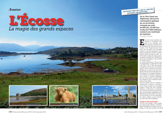 Enfin, un road-trip de plus de 1 200 km vous est proposé à travers l’Ecosse. Un territoire sauvage où les lacs, les îles et les châteaux foisonnent. La rédaction vous donne toutes les bonnes adresses pour partir à la découverte de ce pays et profiter de toutes ses richesses !
