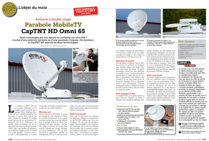 Pour les voyageurs connectés, Camping-Car Magazine fait le point sur la parabole MobileTV. Avec la CapTNT HD Omni 65, vous n’aurez plus à choisir entre le satellite et la TNT. cette antenne sélectionne elle-même le meilleur canal pour une retransmission optimale de vos chaînes télévisées. Notre journaliste vous propose l'essai de cette antenne.