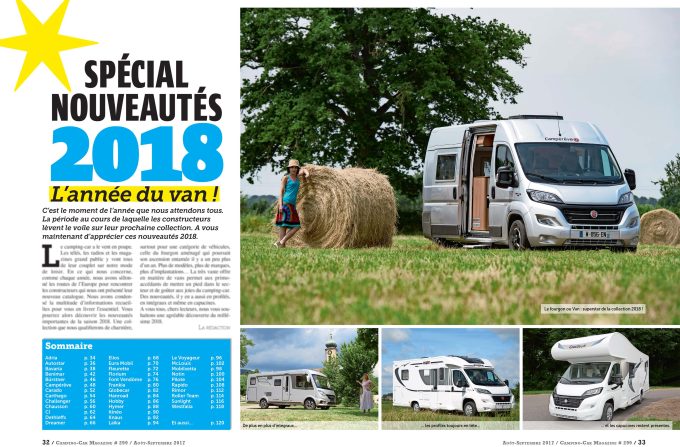 Camping-Car Magazine n°299, daté des mois d’août et septembre 2017 vient de sortir chez tous les bons marchands de journaux ! Et ce nouveau numéro est riche ! Vous y retrouverez toutes les nouveautés majeures de 2018 des principaux constructeurs de camping-cars : Rapido, Challenger, Hymer, Adria… vous découvrirez leurs dernières innovations et implantations.
