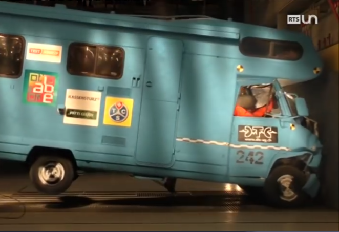 La chaîne helvétique Radio Télévision Suisse s’est rendue au Dynamic Test Center, basé à Vauffelin, pour réaliser le crash test d’un camping-car.