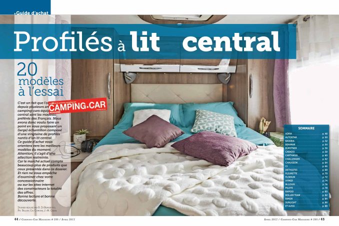 La rédaction vous a concocté un dossier sur les profilés à lit central. Ces modèles sont aujourd'hui les plus demandés par les camping-caristes. Nous avons sélectionné 20 modèles à lit central présentés sous forme d'essais camping-car. Pour élargir l'éventail de l'offre, nous avons ajouté plusieurs autres références qui correspondent à la thématqiue du lit central. Pour se faire un avis sur ces profilés emblématiques, nous ne saurons vous conseiller d'acheter ce numéro de Camping-Car Magazine.