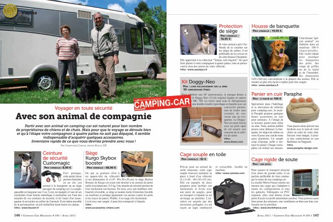 Nous avons également abordé le sujet du transport des animaux de compagnie. Nous vous proposons plusieurs objets qui s'avèrent utiles pour que votre chien ou votre chat voyage à bord de votre camping-car en toute sécurité.