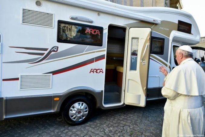 Pour célébrer l'événement, la marque italienne Arca a offert au pape François un camping-car M725 GLT.