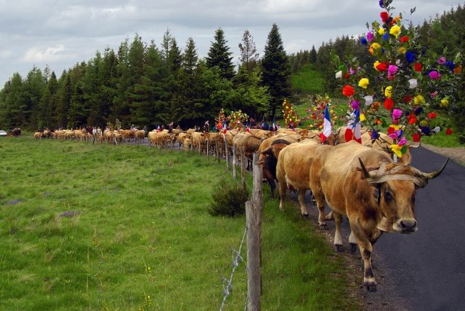 Les beaux jours arrivant, il est temps pour les troupeaux de quitter la vallée pour monter sur le plateau de l’Aubrac, entre 1300 et 1400 m d’altitude, où ils pourront brouter durant tout l’été une herbe grasse et fleurie.