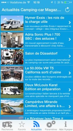Lors de tous vos déplacements, vous pourrez également suivre les toutes dernières actualités de camping-car.com directement consultable via l’appli.