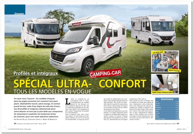Le nouveau numéro de Camping-Car Magazine daté du mois d’avril est disponible. Ce n°306 consacre sa couverture aux modèles « ultra-confort ». Dans ce dossier spécial, vous seront présentés 30 profilés et intégraux, offrant une habilité séduisante que ce soit grâce à un salon lounge, une salle d’eau spacieuse ou un couchage XXL. Des camping-cars tout confort, accessibles à partir de 54 000 € ! Dans un tout autre registre, nous avons testé le Challenger Quartz 274 : un profilé familial compact, sans lit permanent qui assume un aménagement atypique, unique sur le marché. Et du coté des vans et des fourgons aménagés, la Rédaction se penche que le Renault Trafic en faisant un tour d’horizon de marques ayant adopté ce porteur.