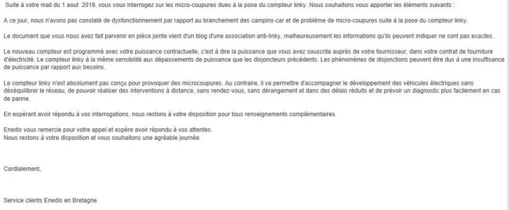 Yannick Allain témoigne : « Pour faire suite à votre article sur le compteur Linky et le dysfonctionnement des frigos lors du branchement sur le secteur, la société "ENEDIS" m’a répondu par le courrier suivant. »
