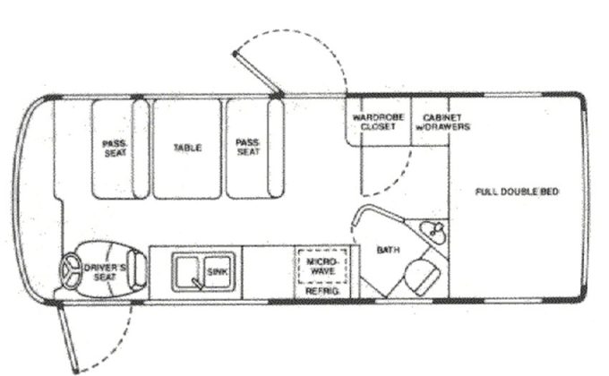 Bien que le véhicule date de la fin des années 80, son aménagement est assez contemporain. Sur le site internet dédiée à la marque, nous avons retrouvé la documentation technique de 98 pages dans laquelle on évoque même un four à micro-ondes, disponible en option. A bord, les occupants disposaient d'une grande dînette convertible en couchage, d'une cuisine avec réfrigérateur à absorption fonctionnant sur 12 volts et d'un réchaud à alcool (il fallait pomper pour obtenir du gaz et la combustion). Sous le toit relevable, à parois rigides et qui s'ouvrait latéralement, logeait un vaste couchage.