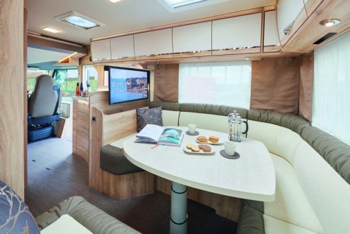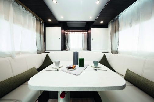 Avec son gabarit de 6,50 m, voici le Mc4 830G, la plus petite cellule qui propose une vaste banquette arrière en U. Une pincée d’accent britannique dans un profilé italien en somme, où le salon fait également office de chambre. Comment ? Simplement en logeant un lit de pavillon double électrique. Toutefois, une fois descendu, il sera impossible de profiter de la dînette… à moins d’aller en partie avant où l’on trouvera un living complémentaire. La salle d’eau est isolée et fait preuve d’un bel espace.
