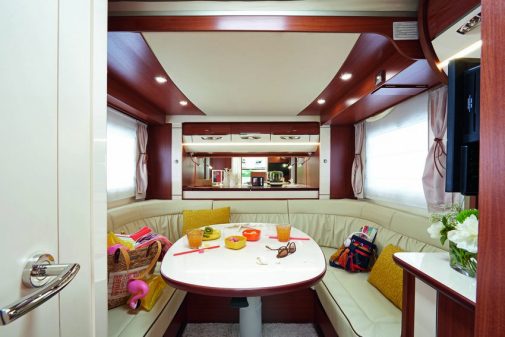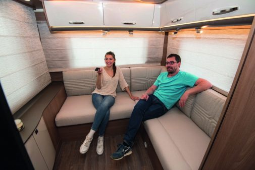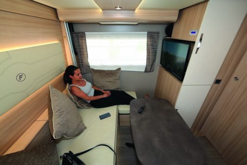Parmi les différentes propositions à salon arrière de Bürstner, en intégral Ixeo et profilés Lyseo, nous avons sélectionné le TD744. Un modèle de 7,50 m de longueur qui a fait clairement ses preuves en termes de confort. L’ambiance générale est flatteuse, le traitement de cet espace salon dépasse toutes nos attentes. S’y prélasser, s’y retrouver, regarder la TV… ce poste permet vraiment de se sentir comme à la maison. Bürstner a en revanche privilégié les rangements à un couchage en pavillon.