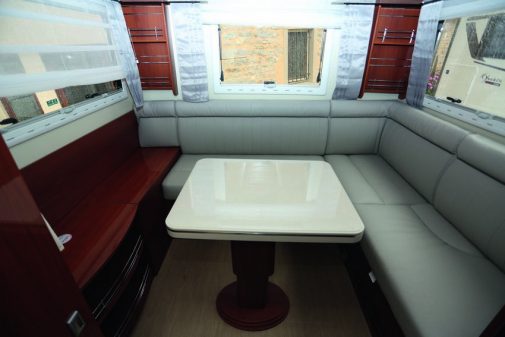 Sous l’appellation K-Yacht 80, Mobilvetta propose un modèle “discret” avec salon arrière. Inondé de lumière grâce aux deux baies, ce poste accueille une banquette en L, une table amovible sur pied en bois massif. Un meuble latéral vient enrichir cet espace. On trouvera par ailleurs une cuisine droite avec un grand réfrigérateur. Elle fait face à la salle d’eau. Quant à l’accueil nocturne, cet intégral est doté d’un lit de cabine en partie avant et d’un couchage en pavillon logé astucieusement au-dessus du living.