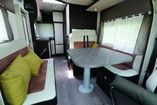 Pour faire face à l’essor des fourgons de 5,99 m, Challenger présente un profilé court et discret, le 180 VIP. Si compacité et maniabilité sont au rendez-vous, ce modèle se démarque de ses concurrents “tôlés” par une meilleure isolation et, à bord, par un habitacle fonctionnel et totalement démesuré. Les assises en vis-à-vis du salon permettent à six personnes de s’installer autour de la table. En revanche, seulement quatre pourront rester à bord, lors d’un usage routier.