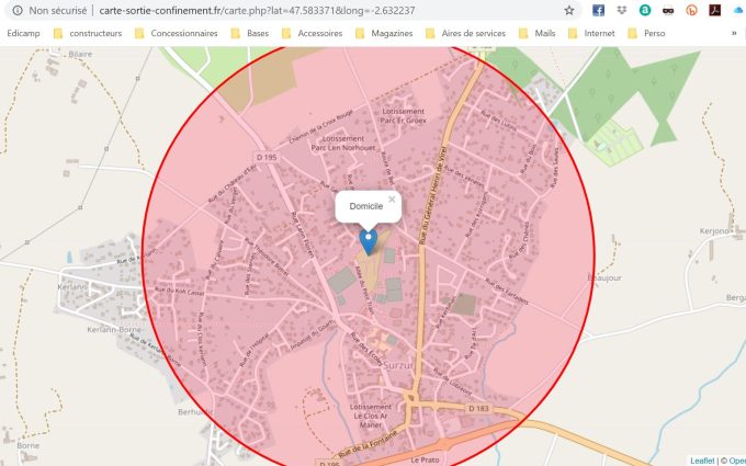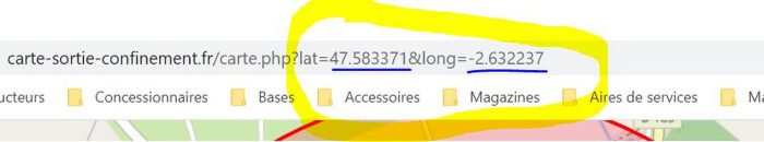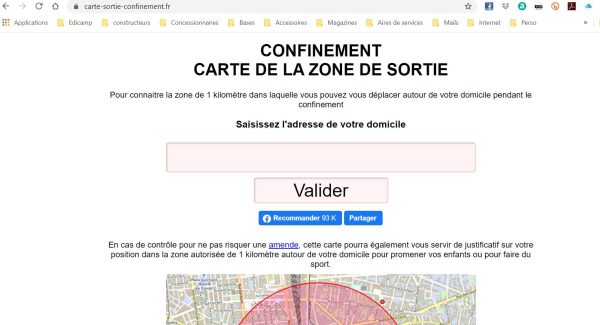 Il suffit de saisir votre adresse du lieu de votre confinement dans le cadre grisé et de valider. Nous avons effectuer le test avec plusieurs adresses et le résultat est immédiat. Il est même possible, pour plus de précisions sur l'adresse du lieu de confinement d'écrire les coordonnées GPS en décimal, directement dans la barre d'état.