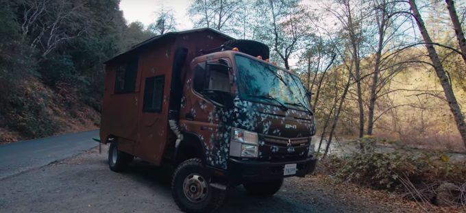 Monté sur un châssis de base Mitsubishi Fuso 4WD de 2012, le camping-car est équipé de panneaux solaires et d'un Tommy Gate à l'arrière, un hayon élévateur.